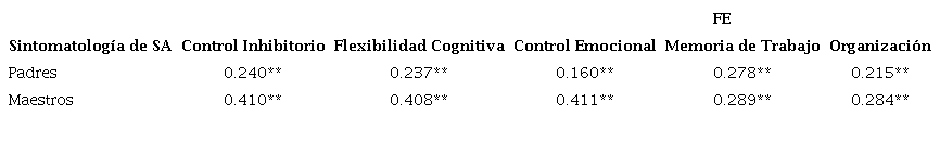 A partir de la información proporcionada por padres y maestros, se obtuvieron prevalencias del 0.6% (padres) y 0.2% (maestros) de niños con síntomas de SA. La media de edad de los niños era de 5.21 años (DE=0.431). Las correlaciones de Pearson indicaron que la sintomatología de SA presenta una relación significativa con algunos déficits de la FE, como Control Inhibitorio, Flexibilidad Cognitiva, Control Emocional, Memoria de Trabajo y Organización (ver Tabla 2).