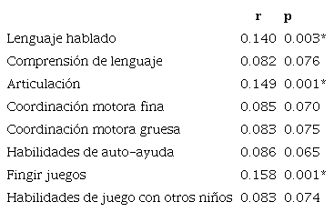 Por otra parte, los maestros informaron altas correlaciones entre la sintomatología de SA y algunas características del desarrollo evaluadas: problemas en el lenguaje hablado (p=0.003), en la articulación (p=0.001), y en las dificultades para fingir juegos (p=0.001) (ver Tabla 3). Además, se evaluó la comprensión del lenguaje, la coordinación motora fina y gruesa, habilidades de auto-ayuda y la intención del juego con otros niños, los resultados de las correlaciones indican significancias menores a 0.10, sin embargo, no menores a 0.05.