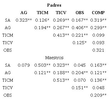Además, se exploró la relación de la sintomatología de SA y síntomas internalizados; así, de la información proporcionada por los padres se encontraron correlaciones significativas con síntomas de Ansiedad Generalizada (AG) (p=<0.001), Tics Motores (TICM) (p=.027), Tics Verbales (TICV) (p=<0.001), Obsesiones (OBS) (p=0.003) y Compulsiones (COMP) (p=<0.001); mientras que los resultados de maestros, indicaron correlaciones significativas con TICM (p=<0.001), TICV (p=<0.001) y COMP (p=<0.001). A su vez, cada uno de estos trastornos presenta comorbilidad entre sí (ver Tabla 4).