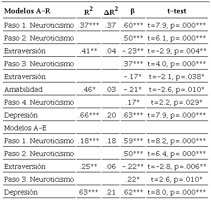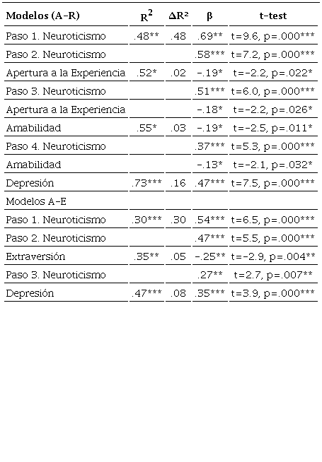 En las madres monoparentales divorciadas (ver Tabla 5), se obtuvieron cuatro pasos para la A-R y tres para la A-E. Afectan la A-R el Neuroticismo, la Amabilidad, la Responsabilidad y la depresión; mientras que la A-E se ve afectada por el Neuroticismo la Extraversión y la depresión.