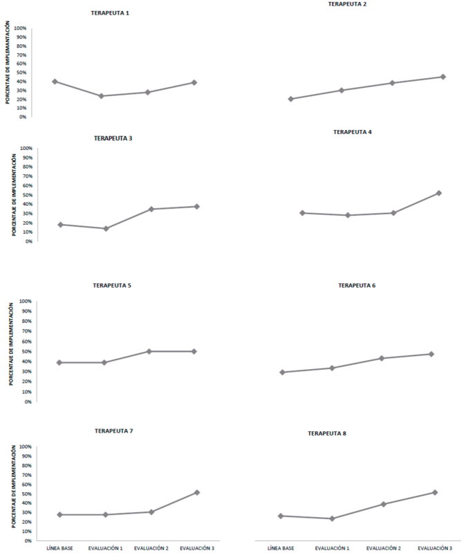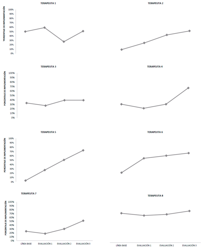 Para el procedimiento de análisis funcional se observa en todos los casos una tendencia al incremento en el nivel de implementación a lo largo del entrenamiento de los profesionales de la salud. La línea base se situó entre el 13% y el 40% de implementación. En la primera evaluación, se observó un incremento en el nivel de implementación en 4 de los 8 casos y en la evaluación dos se apreció un incremento en los porcentajes de implementación en todos los profesionales de la salud. Finalmente, en comparación con la línea base, el nivel de implementación en la evaluación tres, es decir, al finalizar el entrenamiento, mostró valores superiores al 38%, y en 7 de los 8 casos, representó un incremento de habilidades de análisis funcional de, en promedio, 21% (ver Figura 1).