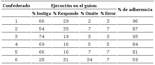 Con respecto a la ejecución de los confederados, se obtuvieron porcentajes de entre 28% y 74% en la categoría de Instiga (el confederado presentó los estímulos), entre 16% y 33% en la categoría de Responde (el confederado responde a las preguntas del profesional en la categoría correspondiente), entre 2% y 34% en la categoría de Omite (el confederado no presentó el estímulo) y entre 3% y 7% en la categoría de Error, con acuerdos intra observador entre el 83% y el 100% y acuerdos entre observadores entre 76% y 100%.