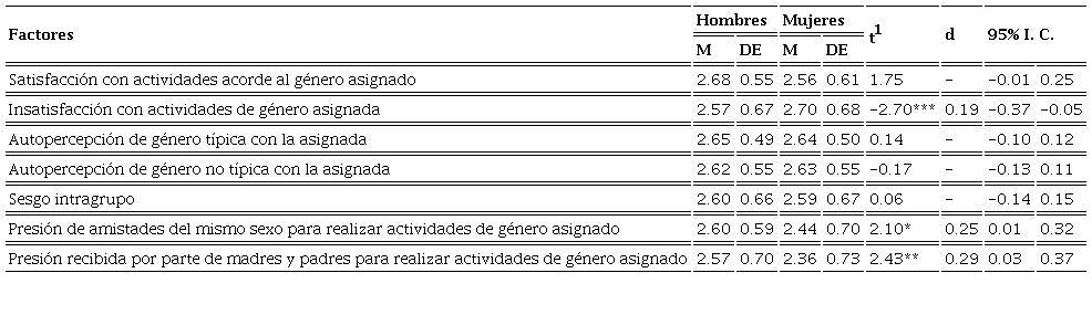 Los primeros análisis realizados fueron la comparación entre hombres y mujeres en las dimensiones de la identidad de género evaluada, como se muestra en la tabla 1. Se encontraron diferencias estadísticamente significativas entre hombres y mujeres en tres dimensiones de la escala. La primera diferencia es en la dimensión de insatisfacción con las actividades de género asignado, las mujeres presentan más insatisfacción (x= 2.70) en comparación con los hombres (x= 2.57). También se encontraron diferencias en la presión de amistades del mismo sexo para realizar actividades del género asignado, en donde los hombres (x= 2.60) presentan mayor presión que las mujeres (x x= 2.44). Finalmente, los hombres (x= 2.57) tienen una media mayor que las mujeres (x= 2.36) en la presión recibida por parte de madres y padres.