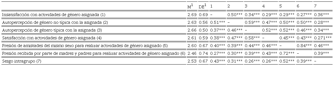 En el caso de las mujeres se encontró que la autopercepción de realizar conductas que no son típicas a su género asignado correlaciona con una mayor presión por parte de sus amistades y familiares. También se identifica una congruencia con respecto a la satisfacción con las actividades de género asignado con la autopercepción de que son actividades típicas al género. Se observa que cuando reportan mayor autopercepción de realizar actividades típicas al género que le asignaron, perciben mayor presión por sus amistades del mismo sexo para realizarlas. Un hallazgo interesante es la correlación entre la insatisfacción con actividades de género asignado con la autopercepción de género no típica con la asignada.