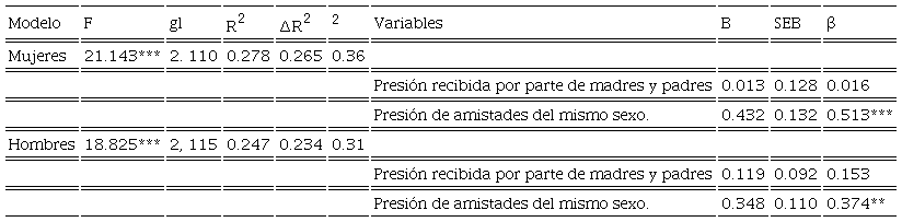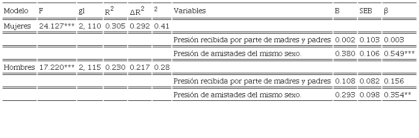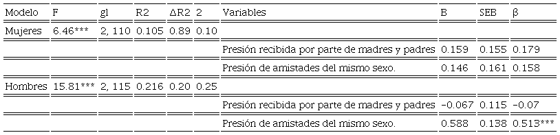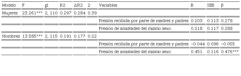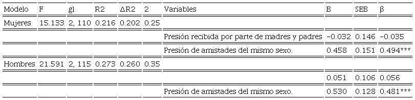 Finalmente, se realizaron cinco análisis de regresión múltiple mediante el método enter para identificar el impacto que tiene la presión recibida por amistades y familia en cada una de las dimensiones de la escala de identidad de género. De manera general, se puede identificar en todas las tablas que los resultados indican que existe un efecto de presión social por parte de las amistades del mismo sexo para ejercer la identidad de género, no siendo así por parte del grupo social de los padres.
