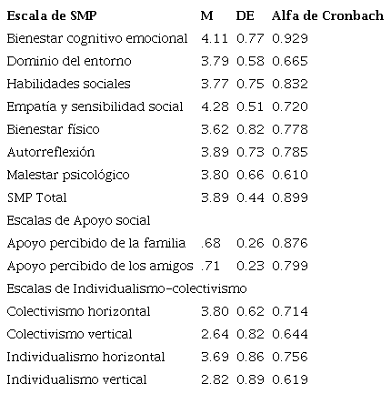 En la tabla 1 se presentan los datos descriptivos para cada factor donde se observa en SMP puntuaciones ligeramente arriba de la media, siendo Bienestar cognitivo emocional y Empatía y sensibilidad social con la media más alta. En Apoyo social percibido también se reportaron resultados arriba de la media teórica y para individualismo-colectivismo, la muestra resulto en promedio más alta que la media teórica en CH, seguida de IH y por debajo de la media en CV e IV (ver Tabla 1).