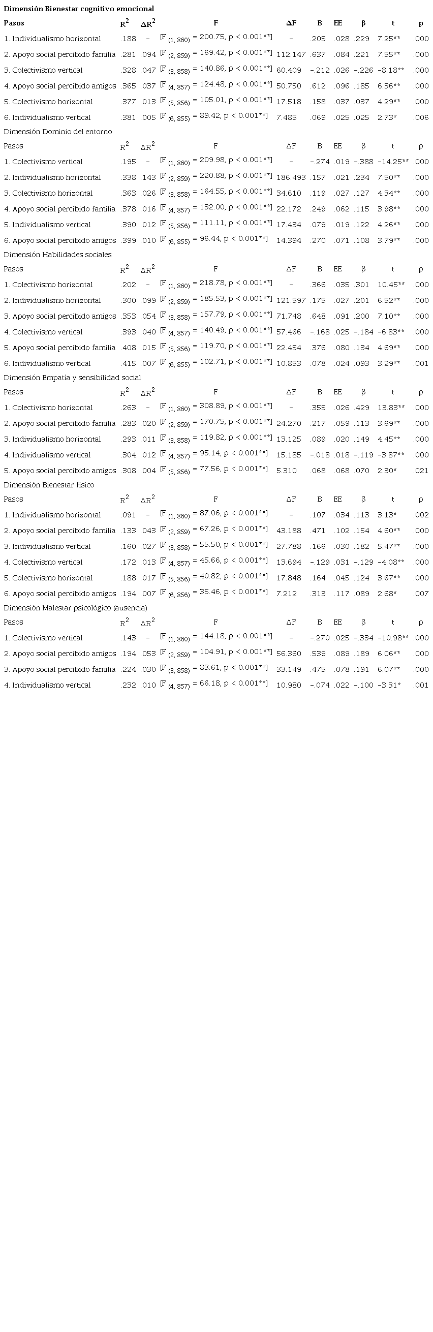 Para conocer los mejores predictores de la SMP se realizaron análisis de regresión con el método paso a paso para la muestra general, observando los supuestos estadísticos pertinentes, teniendo como variable dependiente cada factor de SMP y las variables apoyo social percibido de la familia (ASPF), apoyo social percibido de los amigos (ASPA), IH, CH, IV y CV como variables independientes. Se produjeron modelos estadísticamente significativos para las dimensiones de SMP: Bienestar cognitivo emocional, Dominio del entorno, Habilidades sociales, Empatía y sensibilidad social, Bienestar físico y Ausencia de malestar psicológico que explican entre 19.4% y 41.5% de la varianza con los diferentes predictores (ver Tabla 3).