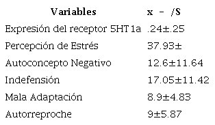 A continuación, se presentan los promedios y desviación estándar de la expresión génica del receptor 5HT1a, percepción de estrés, autoconcepto negativo, indefensión, mala adaptación y autoreproche (ver Tabla 1).