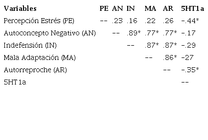 En la tabla 2 se presentan correlaciones de Pearson entre percepción de estrés, autoconcepto negativo, indefensión, mala adaptación, autorreproche y la expresión del 5HT1a.