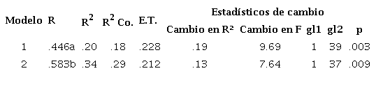 Posteriormente se corrieron regresiones lineales con el método de pasos sucesivos, identificando la percepción de estrés como modelo predictor de expresión del receptor 5HT1a, con una r= 0.44, R2=0.20 y p=0.003 (ver Tabla 3), de igual manera se encontró que autoconcepto negativo e indefensión son modelos predictores de este receptor con un r=0.58, R²= 0.34 y p=0.009; lo que significa que este estilo de pensamiento y el estrés pudiese ser una causa de la expresión reducida del receptor 5HT1a.