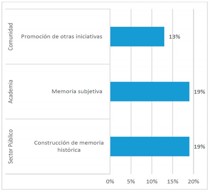 Es fundamental, evidenciar que, la relación semántica de categorías de los documentos muestra la existencia de una necesidad epistemológica y conceptual, en especial, un 19% confluye en que es necesario desarrollar temas de Construcción de Memoria Histórica, otro 19% menciona la importancia de Construir propuestas de Memoria Subjetiva, y un 13% restante considera necesario seguir impulsando Iniciativas de Memoria. Con ello, se revela que aún existe un gran desconocimiento de un tema que es fundamental ampliar en términos científicos, ya que sirve de base interpretativa para la argumentación y defensa legal, en términos de reparación, tratamiento psicológico y construcción de políticas sociales.