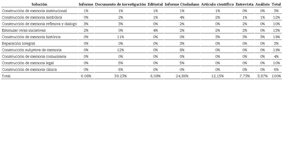 De esta manera se obtiene una clasificación de las tipologías de documentos con relación a los temas y aspectos que aborda, y su postura frente a la memoria y la reparación. Los hallazgos permiten establecer que existe una relación conceptual muy marcada frente a temas de Reparación Simbólica con un 29% y Pedagogía de la Memoria con un 27% de frecuencia de aparición. Siendo los Documentos de Investigación 31% y la Nota Ciudadana con 24%, la forma más usual de abordar el tema en los documentos que circulan en la web. Es importante revisar que la lógica de escritura de estos dos géneros se caracteriza por su distanciamiento de la realidad subjetiva, al estar construidos con un lenguaje objetivo e informal.