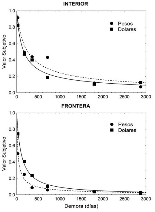 Se graficaron, según las medianas de los puntos de indiferencia, las funciones de descuento temporal de acuerdo con la ecuación 2 para cada uno de los grupos y condición. Como se puede observar en la Figura 1, el descuento causado por la demora en la recompensa adquiere una función hiperboloide para el peso y el dólar, en donde la curva asociada en pesos en la muestra de frontera fue la más pronunciada, mientras que la curva asociada a pesos de la muestra del interior de la república fue la menos pronunciada.