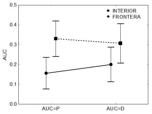 Para corroborar que la experiencia con divisas de diferentes tasas de inflación puede aumentar la sensibilidad a la demora y por lo tanto, aumentar la diferencia entre las tasas de descuento entre pesos y dólares se compararon los valores de la función hiperboloide entre pesos y dólares en cada uno de los grupos. De forma interesante se encontró que, a favor de la hipótesis planteada, la muestra de frontera presentó valores de s más grandes para la tarea en pesos (mediana=1.38) en comparación con el parámetro s de la tarea en dólares (mediana=0.92), esta diferencia fue estadísticamente significativa (z=2.7; p<.007). Así mismo, también a favor de esta hipótesis, no se encontraron diferencias entre pesos y dólares en el parámetro s dentro de la muestra del interior de la república (z=1.79, p=.07). En este sentido, la muestra de trabajadores de la frontera fue más sensible a la relación entre magnitud y demora para la divisa mexicana que para la divisa norteamericana mientras que la muestra del interior no fueron sensibles a este efecto. Sin embargo, contrario a lo planteado, se encontraron diferencias significativas en el parámetro k entre pesos y dólares para la muestra fronteriza (z=2.48; p=.02) pero el orden de la diferencia fue inverso al del parámetro s, esto es, los participantes de frontera tuvieron valores más alto de k (indicando una mayor tasa de descuento) en la tarea de dólares que en la de pesos. Este efecto opuesto se reflejó en la forma de las curvas y la ausencia de diferencias de pesos y dólares en el AUC para esta muestra fronteriza (z=1.79; p=.08).