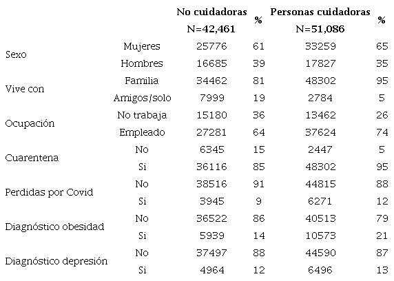 Respecto del total de personas cuidadores de la muestra, 65% son mujeres cuidadoras y 35% son hombres. Tanto las PC como las nPC, mayoritariamente viven en familia (95% y 81%, respectivamente), trabajan (74% y 64%), han estado en confinamiento (83% y 85%) y no reportaron pérdidas por COVID-19 (88% y 91%). Sólo el 21% de las PC reportan tener problemas de obesidad (14% para las nPC) y 13% reportan haber sufrido previamente de depresión (12% para las nPC).