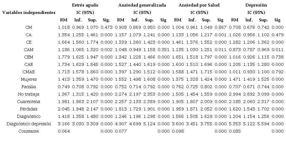 Las razones de momios (RM; odds ratios en inglés) para los perfiles de cuidador(a) y las covariables seleccionadas se muestran en la tabla 3 para cada una de las 4 condiciones de salud mental. La gran mayoría de las RM de los perfiles de cuidador(a) fueron altamente significativos, con excepción de las razones para CM en las condiciones de estrés y ansiedad por la salud, CAM en ansiedad generalizada, y CA, CEM y CMAE para depresión; en estos perfiles la probabilidad de riesgo es similar a la de las personas no cuidadores.