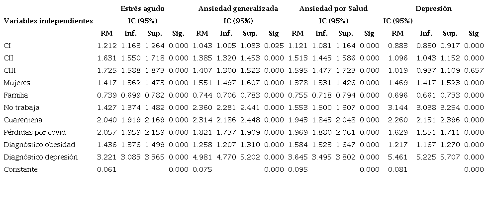 La RM promedio para CI fue de 1.07, de 1.41 para CII, y de 1.45 para CIII, momios que representaron un riesgo adicional 7%, 41% y 45%, respectivamente. Finalmente, el promedio de las RM en cada una de las condiciones sugirió una carga de cuidado diferenciada, siendo mayor para estrés (1.51), seguido por ansiedad por la salud (1.42), ansiedad generalizada