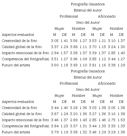 En la condición de foto ganadora, las cinco interacciones dobles resultaron significativas: creatividad F(1, 396) = 77.34, p < .001, calidad global F(1, 396) = 115.52, p < .001, impacto emocional F(1, 396) = 104.86, p < .001, competencia F(1, 396) = 90.64, p < .001 y futuro del artista F(1, 396) = 81.21, p < .001. Para analizar las interacciones dobles se realizaron ANOVAS simples de medidas repetidas, por separado para comparar los puntajes medios asignados a los fotógrafos mujeres y hombres profesionales y para mujeres y hombres aficionados. El nivel de significancia por comparación se fijó en .003. Se encontró que hubo diferencias confiables entre los supuestos fotógrafos femeninos y masculinos profesionales y aficionados en las cinco variables dependientes (creatividad F(1, 396) = 44.57, p < .001 y F(1, 396) = 33.79, p < .001, respectivamente para profesionales y aficionados; calidad global de la fotografía F(1, 396) = 58.13, p < .001 y F(1, 396) = 49.42, p < .001; impacto emocional de la foto F(1, 396) = 45.90, p < .001 y F(1, 396) = 55.37, p < .001; competencia del autor F(1, 396) = 49.28, p < .001 y F(1, 396) = 48.96, p < .001; futuro del artista F(1, 396) = 33.06, p < .001 y F(1, 396) = 46.64, p < .001). En los cinco casos, los fotógrafos profesionales recibieron puntuaciones medias más altas que las fotógrafas profesionales. En cambio, las fotógrafas aficionadas recibieron puntuaciones medias mayores que los fotógrafos aficionados.