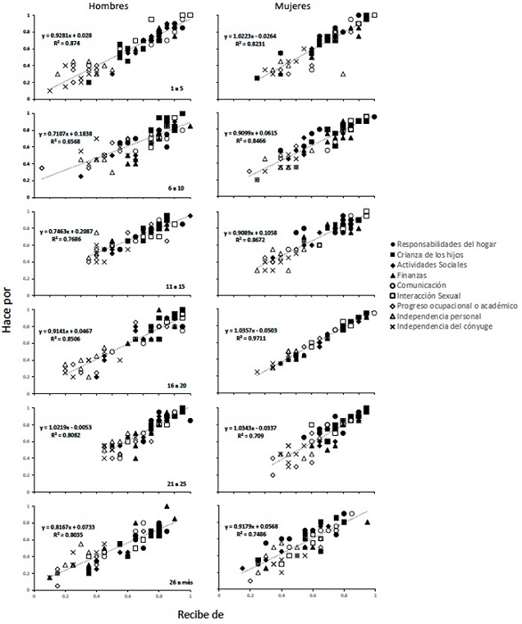 En la Figura 2 se presentan las proporciones de las actividades que los participantes reportaron que hacen por su pareja (ordenada) en relación con las actividades que reportaron que reciben de su pareja (abscisa), para cada área de interacción marital (paneles). Cada punto representa el promedio del número de actividades reportadas por los 20 participantes de cada bloque de años de matrimonio (símbolos) en cada panel. Los nueve paneles superiores muestran los datos de los hombres y los nueve paneles inferiores muestran los datos de las mujeres. En todas las gráficas, la línea punteada muestra la regresión lineal de la proporción de actividades hace por predicha por la proporción de actividades recibe de.