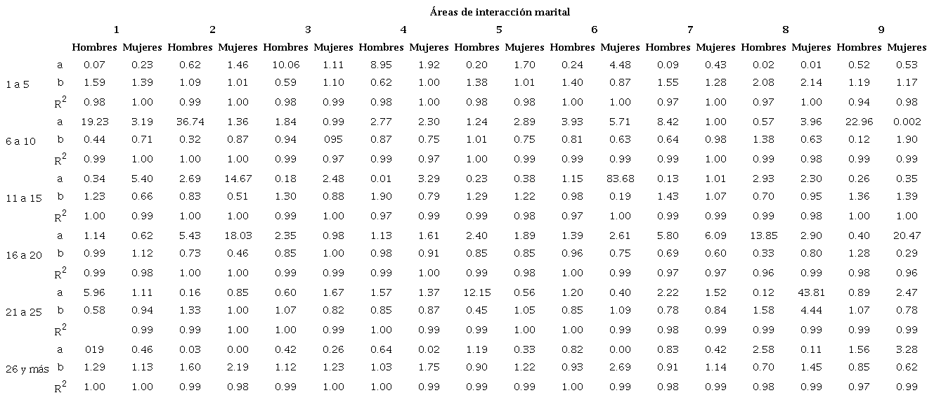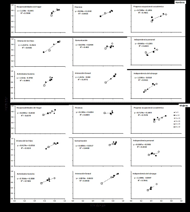 Para cada bloque de años de matrimonio se condujeron regresiones lineales con la proporción de actividades hace por predicha por la proporción de actividades recibe de. Con estas regresiones se estimó la desviación de la igualación entre las proporciones; esto es, las pendientes mayores a 1.0 mostrarían que los participantes reportaron hacer más actividades que las que reportaron recibir. Las pendientes menores a 1.0 mostrarían que los participantes hicieron menos actividades de las que recibieron, y si el valor es cercano a 0.5 indicaría indiferencia. Es decir, los participantes mostrarían hacer el mismo número de actividades, independientemente de lo que recibieron de su pareja. En breve, se encontró que para los hombres la pendiente varió entre 0.71 (bloque 6 a 10 años) y 1.02 (bloque 21 a 25 años), con coeficientes de determinación de 0.65 y 0.80, respectivamente. En el caso de las mujeres la pendiente varió entre 0.908 (bloque 11 a 15 años) y 1.035 (bloque 16 a 20 años), con coeficientes de determinación de 0.86 y 0.97, respectivamente.
