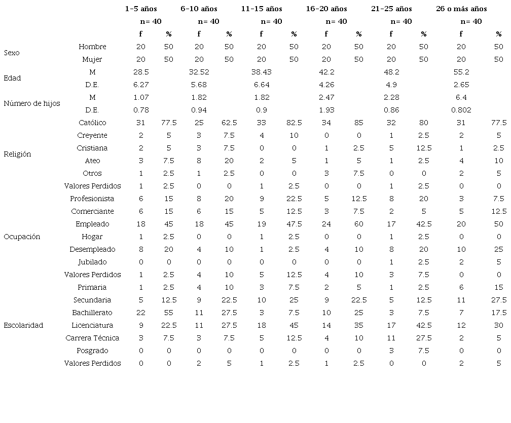 En la Tabla 1 se muestran las características sociodemográficas de los participantes para cada bloque de edad. De manera general, se observa que las frecuencias más altas para el tipo de religión, la ocupación y la escolaridad son católica, empleado y bachillerato, respectivamente.