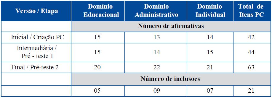 A primeira versão contava com 42 itens distribuídos nos domínios que foram criados e nomeados como educacional, administrativo e individual e que contabilizavam 15, 13 e 14 afirmativas sobre o PC.