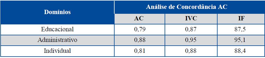 O domínio administrativo foi o que teve maiores pontuações nas análises de concordância realizadas no PC, perfazendo 95% no Índice de Fidedignidade e 0,88 no Alfa de Cronbach. Houve 01 questão do total de 22 que obteve menor concordância com 76,14% e 8 questões que apresentaram 95,23% de fidedignidade.