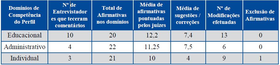 A avaliação qualitativa representada pela validade de conteúdo do domínio educacional foi o que mais apresentou inferência dos entrevistadores. Dos 21 juízes, 47,6% teceram comentários acerca do material. As afirmativas receberam contribuições no mínimo de 5 e máximo de 20 por juiz. Todos os pareceres realizados foram pertinentes e em sua maioria foram incorporados ao instrumento. As sugestões e comentários feitos pelos juízes agregaram às reflexões das autoras a suposição de que existe maior dificuldade no domínio de competências educacionais.