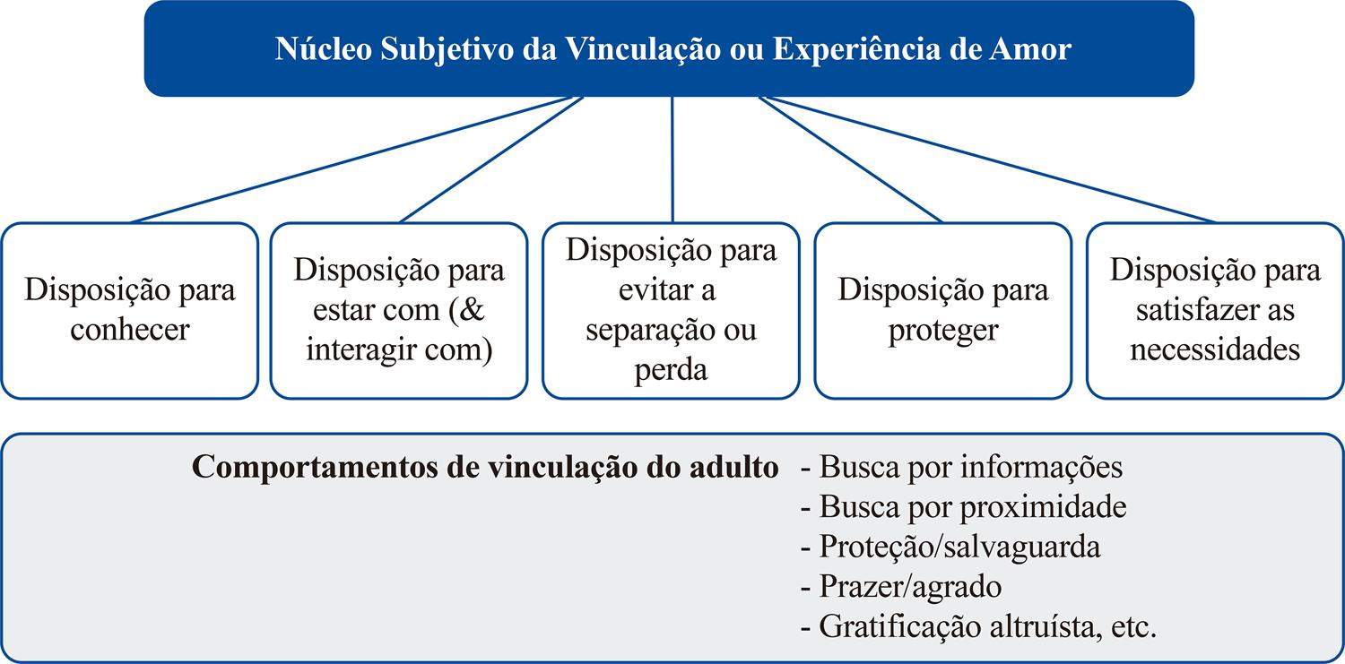 Esse autor apresenta cinco experiências subjetivas (segundo nível do modelo), denominadas ‘disposições ou necessidades’, que expressam a experiência da vinculação ou de amor e que podem gerar comportamentos evidentes (terceiro nível do modelo). Ele não propõe que estas experiências definam a vinculação ou sejam equiparadas ao amor parental. Dentro da sua teoria, estas disposições são tratadas como indicadores ou presença provável da vinculação 4.