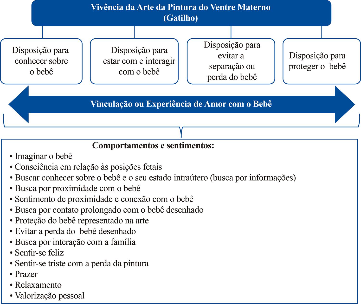 A interpretação dos dados dessa pesquisa, fundamentada na teoria de Condon4, possibilitou elaborar um modelo hierárquico da experiência subjetiva da vinculação ou de amor da gestante com o bebê, mediada pela Arte da Pintura do Ventre Materno (Figura 3).