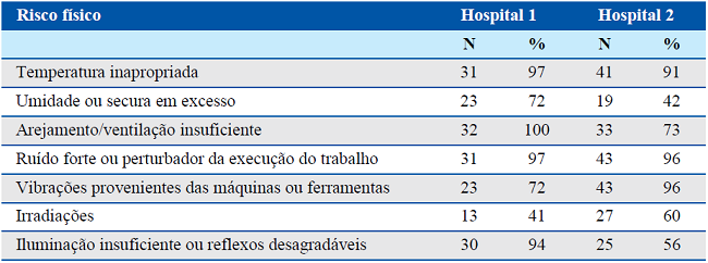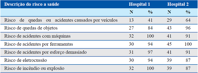 Entre os riscos físicos identificados, a ventilação insuficiente prevaleceu 32 (100%) no Hospital 1, ao passo que no Hospital 2, foi encontrado o ruído muito forte ou perturbador para execução do trabalho e vibrações provenientes das máquinas ou ferramentas de trabalho 43 (96%), como os mais enaltecidos (Tabela 3).