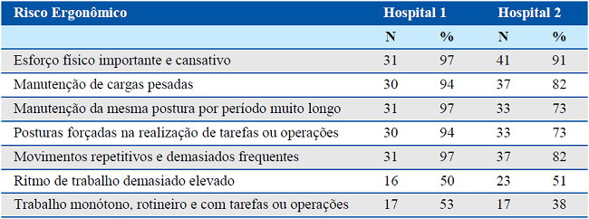 Ao considerar os riscos ergonômicos; os mais relevantes foram mencionados no Hospital 1, e estão relacionados ao esforço físico repetitivo, onde o trabalhador sente esgotamento em seu horário de trabalho. Isso é decorrente da manutenção na mesma postura por longo período e movimentos demasiados, com os resultados de 31 (97%), enquanto que do Hospital 2 prevaleceu o esforço físico importante e cansativo 41 (91%) (Tabela 2).