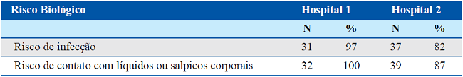 Sobre os riscos biológicos, 32 (100%) dos participantes do Hospital 1 referiram ao risco de infecção enquanto que 39 (87%) do Hospital 2 acreditavam estar mais vulneráveis ao constante contato com líquidos ou salpicos corporais (Tabela 4).