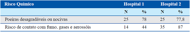 No que se refere aos riscos químicos, 25 (78%) e 25 (77,8%) do Hospital 1 e 2, respectivamente, registraram o contato com fumo, gases e aerossóis, como sendo os mais relevantes (Tabela 5).