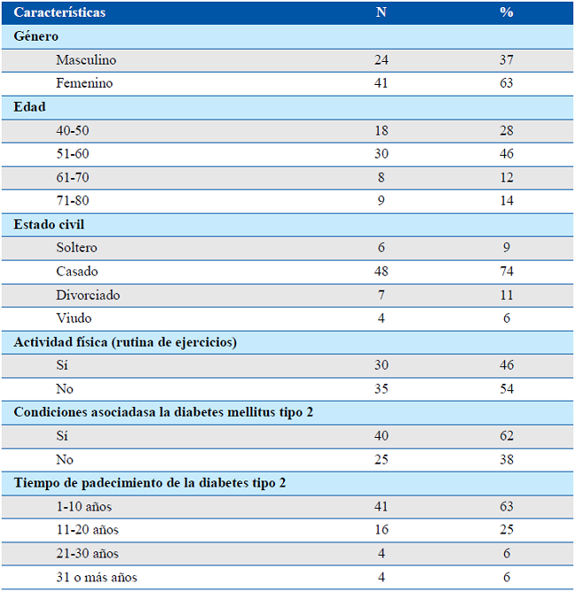 En el presente estudio participaron 65 personas diagnosticadas con diabetes mellitus tipo 2 de una comunidad del área oeste de Puerto Rico que consta de una población de 323 personas. La muestra fue probabilística, seleccionados/as aleatoriamente de una muestra de 175 participantes elegida científicamente, mediante el calculo para muestras pequeñas de Krejcie y Morgan. Se le garantizó su voluntariedad, anonimato y el derecho a abandonar su participación cuando lo consideran necesario a todos los participantes. Entre los criterios de selección de la muestra se encontraban: ser mayor de 21 años, tener un diagnóstico confirmado de diabetes mellitus tipo 2 y saber leer y escribir. Se excluyeron pacientes diabéticos con problemas cognitivos. En la Tabla 1, se puede apreciar la distribución de frecuencias de las variables sociodemográficas que manifestaron los participantes del estudio y el nivel de ansiedad presentado.