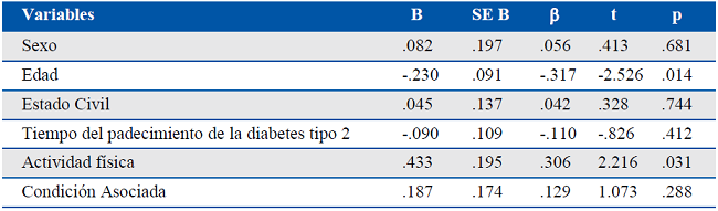 El estudio revela que el 62% de los participantes experimentan niveles bajos de ansiedad en comparación con el resto de la muestra (ver Tabla 2). Al observar los resultados del análisis de regresión múltiple, los valores beta en la Tabla 3, muestran que la edad tiene efecto predictivo, de manera inversa con el componente de la ansiedad (b = -317, p = .014). Mientras, que la variable de la actividad física fue un factor positivamente predictivo del componente de la ansiedad (b =.306, p = .031). En contraste, los valores beta, de las variables que comprenden el sexo, el estado civil, tiempo del padecimiento de la diabetes mellitus tipo 2 y sus condiciones asociadas, las cuales no contribuyen a predecir la ansiedad del paciente con diabetes mellitus tipo 2 (p>.05).