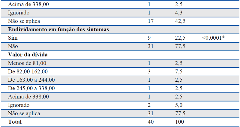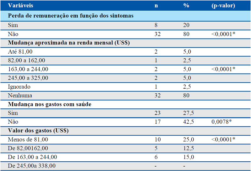 De acordo com a Tabela 2 é possível identificar que 20% dos participantes relataram perda de emprego ou afastamento de atividade remunerada que exerciam devido a doença, comprometendo a renda média mensal em US$ 85,0041 (US$ 81,35 a US$ 325,42). Do total de sintomáticos respiratórios estudados, 9 (2,5%), precisaram tomar dinheiro emprestado, 23 (27,5%) informaram que houve mudança no padrão de gastos da família com saúde, com redução de até US$ 244,00. As consequências econômicas do surgimento de sintomas respiratórios impactaram na renda familiar, mas não ocasionaram endividamento para a maioria dos participantes (N=31, 77,5%).