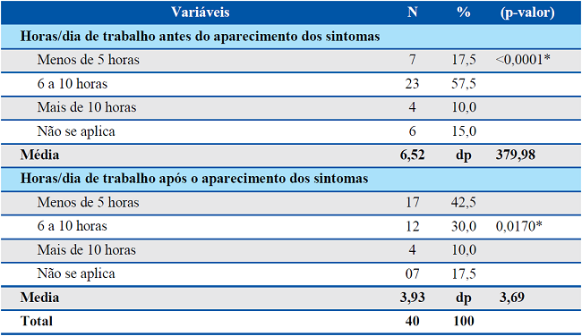 O surgimento dos sintomas respiratórios ocasionou redução das horas trabalhadas por dia. Os dados da Tabela 3, mostram que, antes do surgimento dos sintomas, a maioria dos participantes (N=23, 57,5%) trabalhava de 6 a 10 horas por dia, média de 6,52/horas-dia. Após o início dos sintomas, a média de horas trabalhadas foi de 3,93/horas-dia.