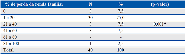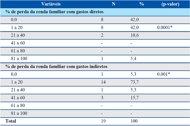 A Tabela 5, mostra a estratificação de perdas financeiras, quando o sintomático respiratório era o chefe da família, identificando-se que as perdas com gastos diretos foram menos referidas pelos participantes quando comparado com gastos indiretos, visto que 42,0% (N=8) não reconheceram perdas diretas, e outros 42,0% (N=8) referiram perdas entre 1 e 20%. Os gastos indiretos mostraram maior expressividade para a faixa de 1 e 20% (N=14, 73,7%) de perdas, implicando em comprometimento de renda.