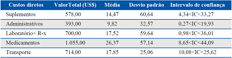 a) Soma total de todos os gastos classificados como custos diretos: administrativos, como consultas médicas; deslocamento; realização de exames; e aquisição de medicamentos e suplementos, como energéticos e vitaminas;