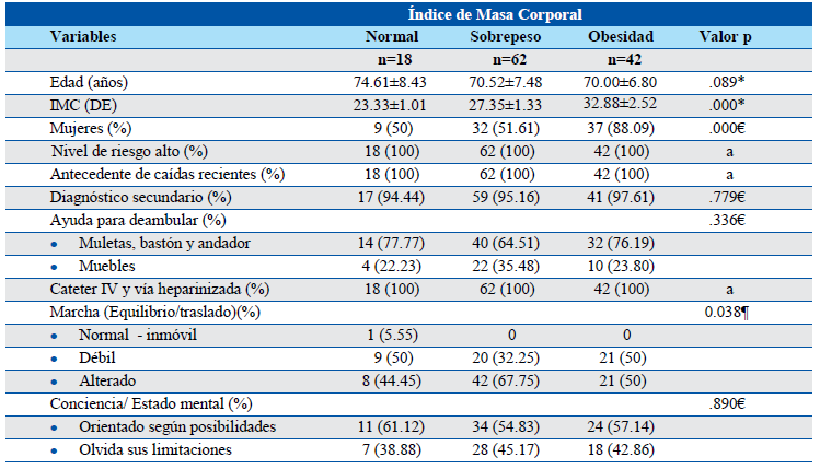 Resultados: La media de edad fue 70.94±7.50 años e Índice de Masa Corporal de 28.66±3.80; antecedente de caídas, tener catéteres intravenosos y la falta de actividad física fueron factores de riesgo predominantes. Se encontró una diferencia estadística significativa entre la marcha y el Índice de Masa Corporal (p<0.05 y V de Cramer=0.204).