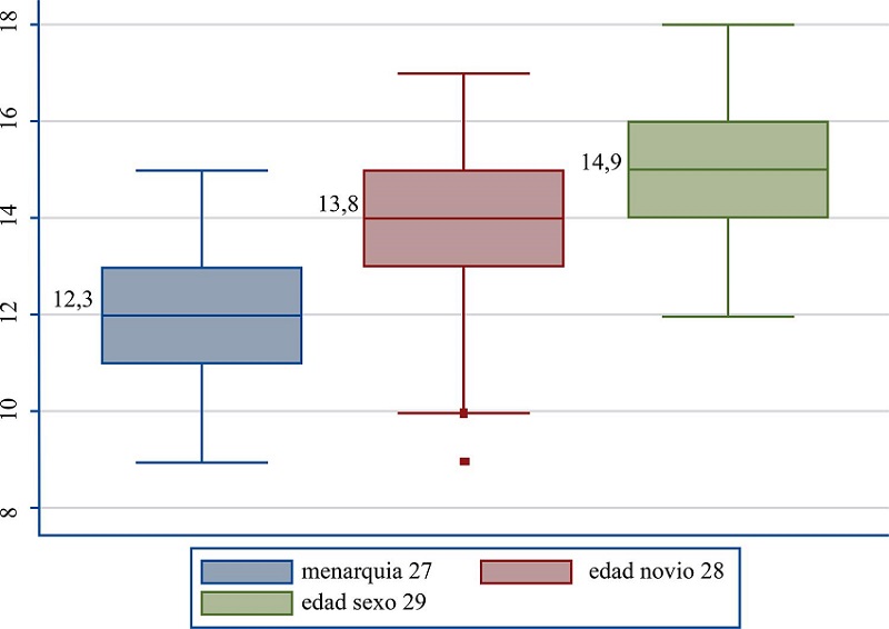En la Figura 2, se presenta la media de edad de la menarquía, edad del primer novio, edad de la primera relación sexual de las adolescentes participantes. Como se esperaba las medias de edad son coherentes en su presentación y difieren en promedio un año entre las mismas. Se observa un valor extremo en la edad del primer novio y se refiere a una participante cuyos datos se validaron y corresponde a una edad de 9 años. Un 29,2% de las gestantes adolescentes iniciaron relaciones sexuales antes de los 15 años, 64,5% entre los 15 y 16 años y un menor porcentaje después de los 16 años.