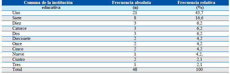 Se presentó una mediana de 2 embarazos (rango 0-11) por institución educativa y en una mayor frecuencia en las instituciones educativas de la comuna 1 o norte de la ciudad y en la comuna 7 de Real de Minas (Tabla 1). La mayoría de las participantes (83,4%) viven en barrios clasificados como estrato 1 y 2 encontrando que más de una cuarta parte de las adolescentes han sido afectadas por el fenómeno del desplazamiento forzado por la violencia.