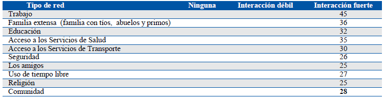 Este instrumento permitió valorar la interacción de la familia con el trabajo; la familia extensa; educación; el acceso a los servicios de salud; el acceso a los servicios de transporte; seguridad; los amigos; el uso del tiempo libre; la religión; y el apoyo de la comunidad. Todos los datos se presentaron con puntuación: Ninguna interacción, interacción Fuerte; interacción Débil e Interacción Estresante. Se encontraron los siguientes resultados (Tabla 2).