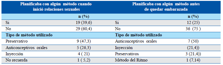 Un 60,4% de las adolescentes embarazadas manifestaron que no usaron ningún método de planificación al inicio de las relaciones sexuales.