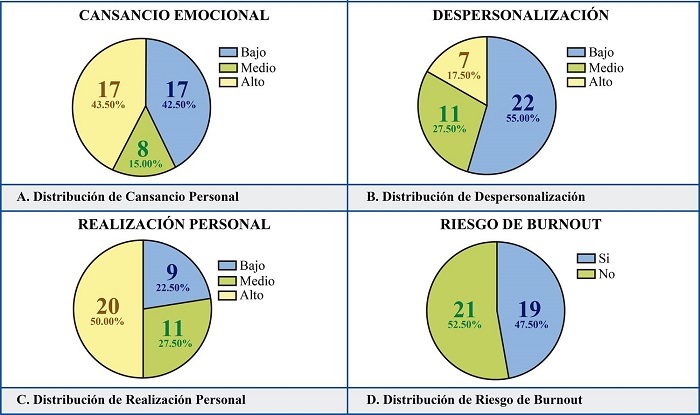 Respecto a los dominios del test, se pudo establecer que un porcentaje mayoritario presentó un nivel alto de cansancio emocional, un nivel bajo de despersonalización y un grado alto de realización personal que llevaron a un alto porcentaje de residentes con riesgo de Burnout, esto a pesar que la bibliografía reporta que el diagnóstico del SB se realiza con puntuaciones altas en los dos rimeros y bajas en el tercero. Hallazgos de SB en en médicos internos y residentes en un hospital Universitario de Busan; fueron asociados con el aumento en la percepción de errores médicos33 ; dichas faltas pueden limitar las posibilidades de mejora del paciente, hasta incluso producir la muerte por falta de toma de decisiones asertivas en los protocolos de atención, escenario que se presenta debido al agotamiento producto de las largas jornadas de trabajo, la tensión al ocuparse de otros pacientes, la preocupación por el endurecimiento emocional, el sentirse falto de vitalidad durante algunos días, la falta de tiempo libre, el no sentir que los problemas emocionales son tratados de forma adecuada y creer que los pacientes lo culpan de sus problemas, son algunas de las percepciones manifestadas por los residentes; las cuales repercuten sobre la salud del estudiante, causando acciones de afrontamiento y autoprotección frente a situaciones estresantes34 , tales como la ansiedad, la depresión, el abuso de sustancias35 , y ausentismo laboral36 . Sin embargo, este estudio no midió ninguno de estos aspectos, pero que por las características similares de participantes, se puede sugerir a las directivas el prestar mayor atención a los procesos formativos en este nivel.