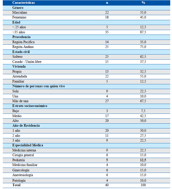 Este estudio incluyo a 40 residentes de especialidades médicas. El 55% (n=22) de los estudiantes eran de género masculino, el 80% se encontraban en un rango de edad entre los 25 a 35 años, siendo la mayoría procedentes del departamento del Cauca (50%), el estado civil predominante fue soltero (62,5%), el 50% manifestaron vivir en un estrato socioeconómico alto, el 55% vive en arriendo, el 67,5% refieren vivir con más de una persona, La mitad de los participantes se encontraban en su primer año de residencia y un 22,5% (n=9) eran residentes de Medicina interna. La Tabla 1 , muestra en detalle las características sociodemográficas y académicas de la población de estudio.
