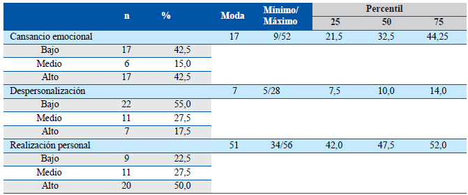 Sobre el Burnout, se observó que el cansancio emocional presenta una moda de puntuación alta con un valor de 17 y un máximo de 52 de los 63 posibles, despersonalización una moda baja con valor de 7 y un máximo de 28 de los 35 posibles y realización personal una moda de 51 con puntaje máximo de 56 de los 56 posibles. El percentil 25 de cansancio emocional y despersonalización presentan valores menores que el mismo percentil del ítem realización personal ( Tabla 2 ).