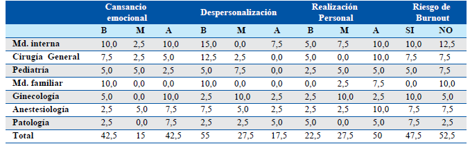 En la Figura 1 , y en las Tablas 2 y 3 , se presentan los puntajes asignados a las variables resultantes del test de Burnout, observando que para el cansancio emocional en dos extremos (bajo y alto) se encuentran los mayores porcentajes con un 42,5% respectivamente, mientras que en despersonalización el 55% lo presenta en calificación baja, el 50% es calificado en alto para realización personal y el 47,5% presenta riesgo de Burnout. De igual manera, se observa que en medicina interna y ginecología se encuentra el porcentaje más alto de riesgo de Burnout con un 10% cada uno. El cansancio emocional se encuentra en calificación alta con mayor porcentaje en residentes de Medicina interna y ginecología con un 10% cada uno La despersonalización se encuentra en mayor porcentaje en calificación baja con mayor frecuencia en residentes de medicina interna con un 15%. La realización persona presenta mayores porcentajes en calificación en alta en residentes de Medicina interna, cirugía general y anestesiología.