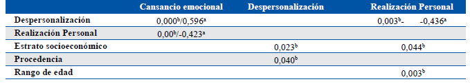 En el análisis de correlación, se encontró relación estadísticamente significativa entre cansancio emocional con despersonalización (p=0,000) con coeficiente de correlación positivo y fuerte (0,596) indicando que a mayor cansancio emocional mayor despersonalización. Correlación entre cansancio emocional con realización personal (p=0,004) con coeficiente de correlación negativo y débil (-0,423) indicando que a mayor cansancio emocional menor realización personal. Así mismo se encontró correlación entre despersonalización con realización personal (p=0,003) con coeficiente de correlación negativo y débil (-0,436) indicando que a mayor despersonalización menor realización personal. Con la prueba de Kruskal Wallis se encontró relación significativa entre despersonalización con estrato socioeconómico (p=0,023) y procedencia (p=0,040) y entre Realización personal con estrato socioeconómico (p=0,044) y rango de edad (p=0,003) ( Tabla 4 ).